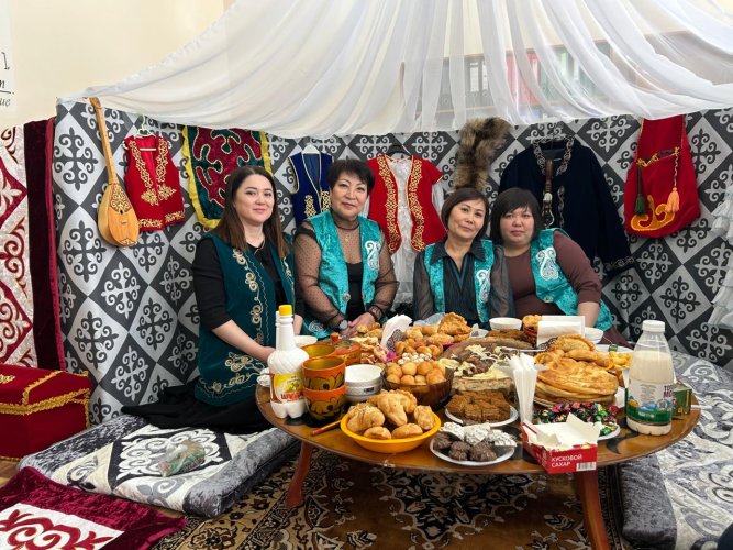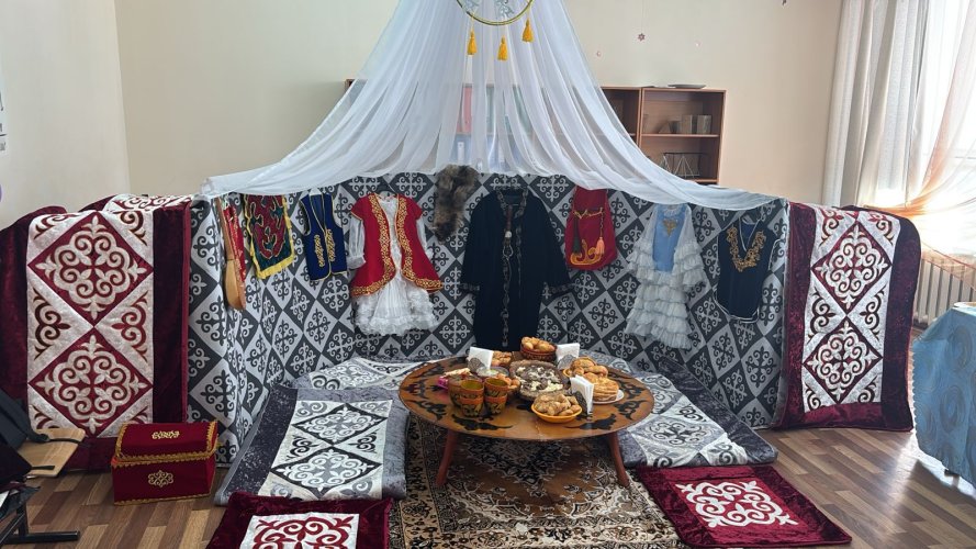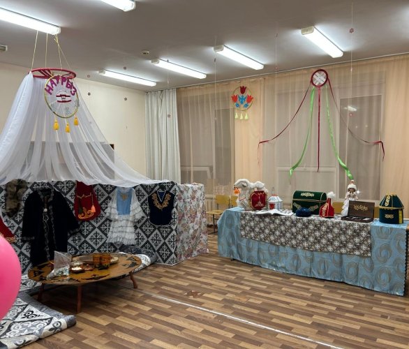 Наш 10 «Б» класс оформляли свой 46 кабинет. В центре кабинета была создана небольшая полу-юрта, которая помогла почувствовать атмосферу традиционного казахского дома. Особое место занял праздничный дастархан. Мы накрыли стол с различными угощениями – бешбармак, баурсаки, шелпеки, курт, сорпа, кумыс, шубат и другие национальные блюда. И все это под шаныраком – символом дома, семьи и единства. Стены кабинета были украшены изображениями весенних цветов и национальными элементами декора. Кроме того, в нашем кабинете была организована небольшая выставка, на которой мы представили книгу о казахских национальных украшениях и одежде, а также сами украшения, чтобы гости могли ближе познакомиться с традиционной культурой.